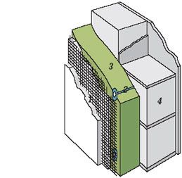 Isolasjonsplatene festes ved hjelp av rustfrie bindere med fall mot fasaden og plastskiver med splitt som klipses på bindertrådene. Det benyttes ulike typer bindere avhengig av type bakvegg. Materialer som er organiske bør unngås i forbindelse med mur- og betongvegger. Det skal for eksempel ikke benyttes forhudningspapp på innsiden av innvendig isolerte mur- og betongvegger. Dampsperre benyttes normalt ikke på innsiden av betong og murvegger.